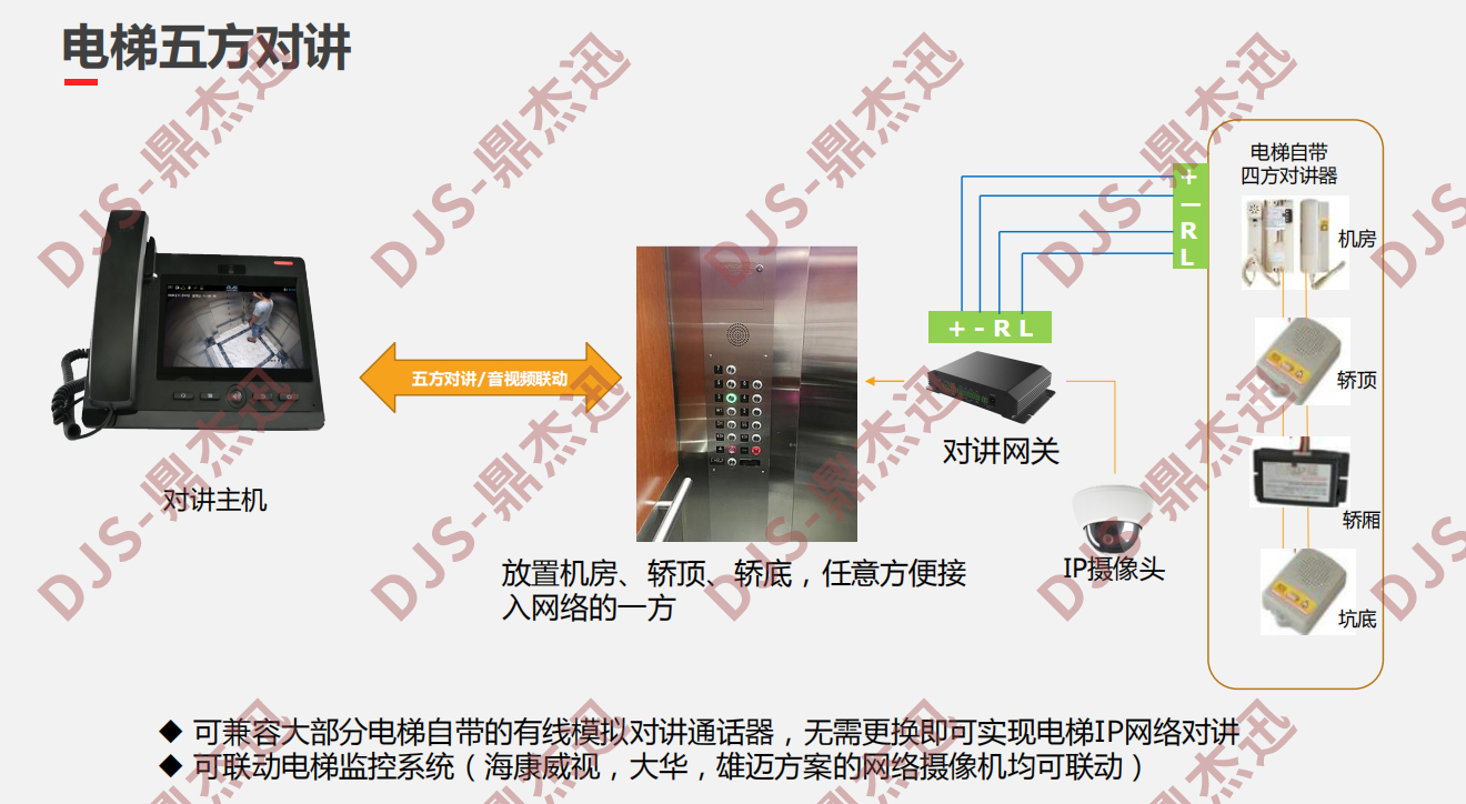电梯IP五方对讲广播融合解决方案,助力电梯行业的信息化发展,将融合通信指挥技术应用亍电梯日常维护应急求助管理中,实现电梯管理的智慧运营。方案以IP网络高清音视频通讯技术为基础,构造了一套以电梯管理为中心的、覆盖电梯的机房、轿顶、轿厢、